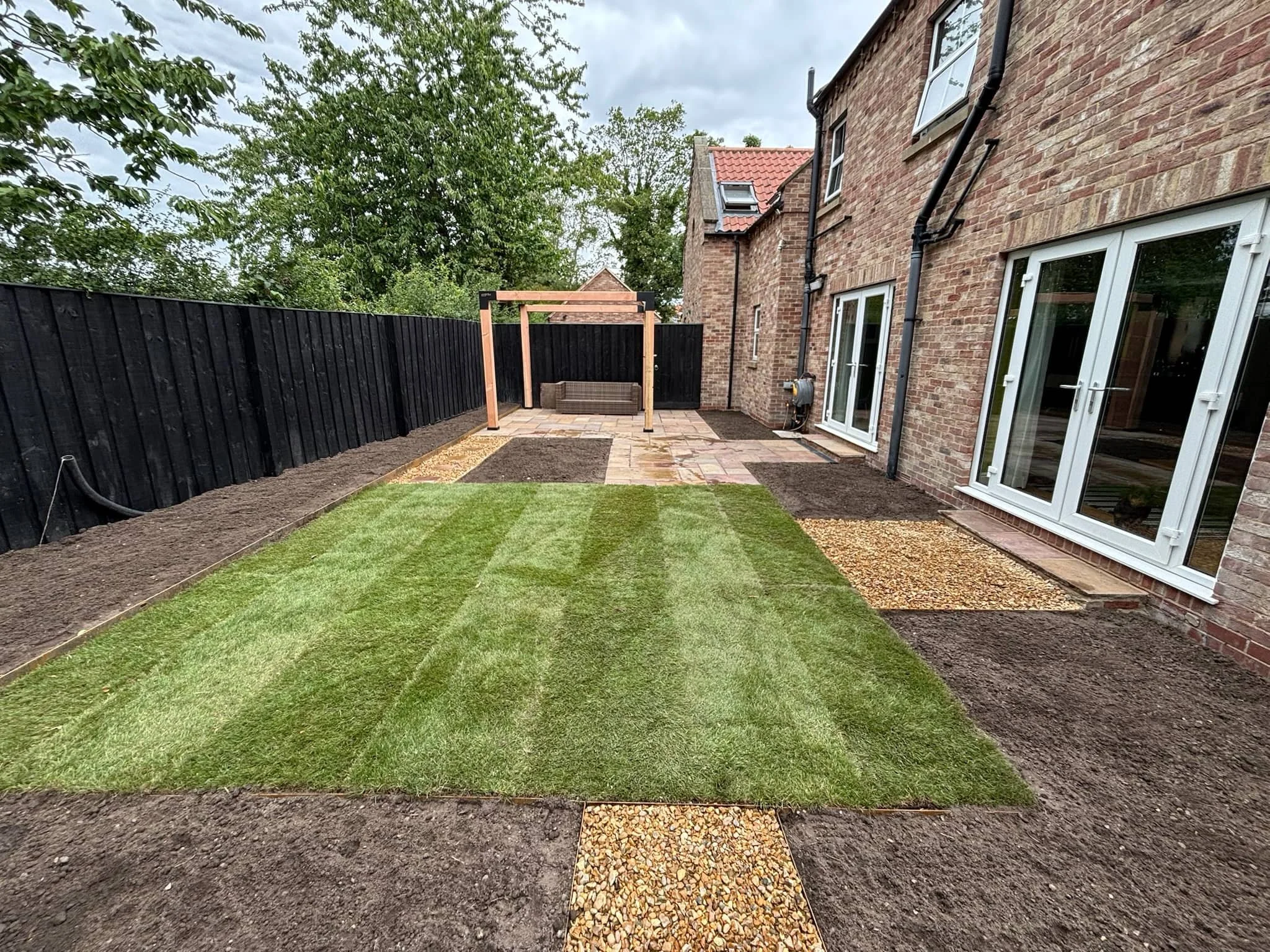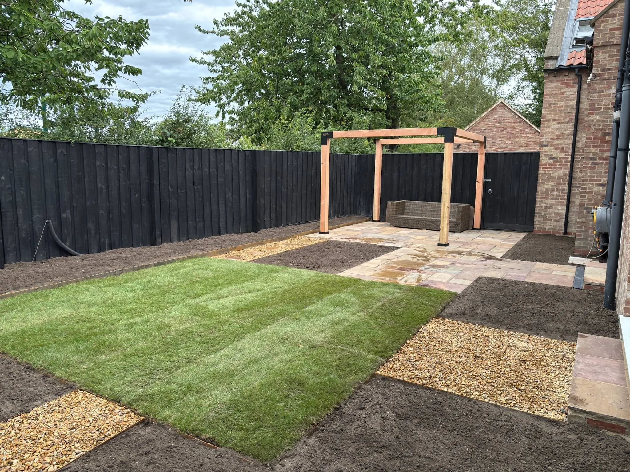 The garden is currently being planted up, but some progress shots are shown below with the hard landscaping complete. The boundary fence was stained black to allow it to visually push it into the background, allowing planting to ‘pop’ in the foreground.